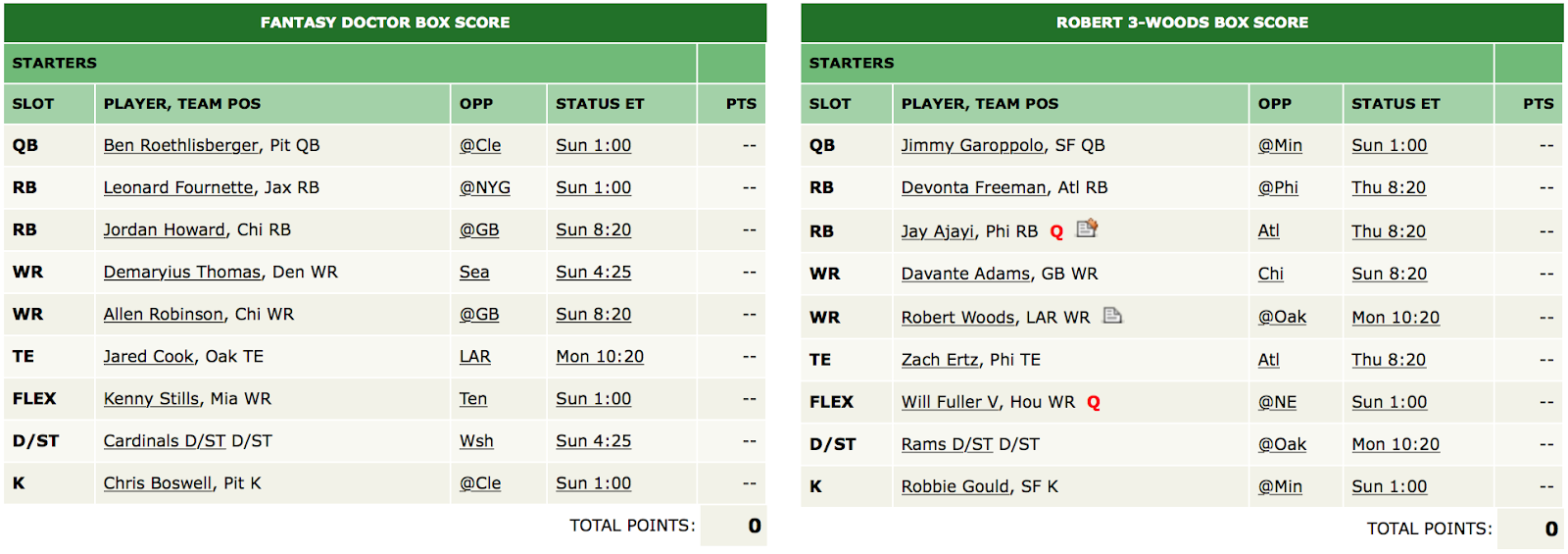 Bobby Woods will be watching closely on Thursday night. He needs have a big game from some of his studs: Ertz, Freeman, Ajayi. If there is not a sizable gap between the two teams after Thursday - Mr. Woods might need to set his eyes on next week or the trade block.