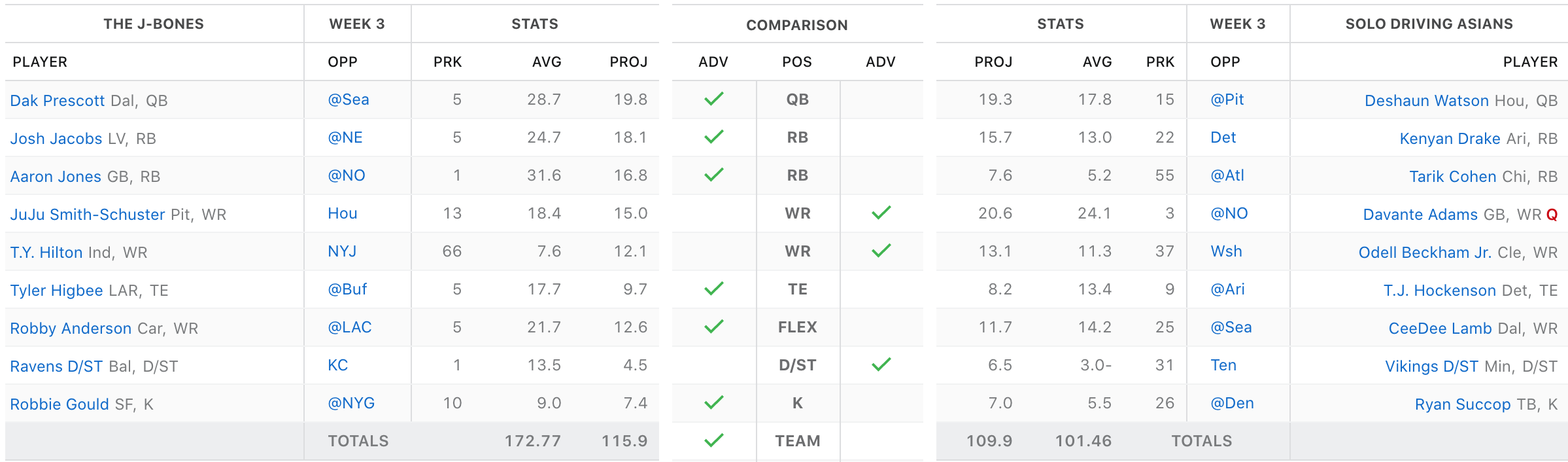 What a rough week for a team that has averaged 170 points through the first two weeks - scoring more than 50 points below average and still winning by nearly 40 points. If anything, that should tell you a little bit about these two teams...