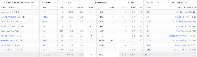 Reasoning: This is the biggest disadvantage for Team Hatred - not because Charbonnet and Dowdle are terrible, but because it should be Barkley and Edwards.... bye week. It is tough to have both your starting running backs out when you need to get a win. On the flip side, Mixon and Etienne are both in line for a good week as their respective teams face-off against each other and neither team really brings in that stellar of a defense.